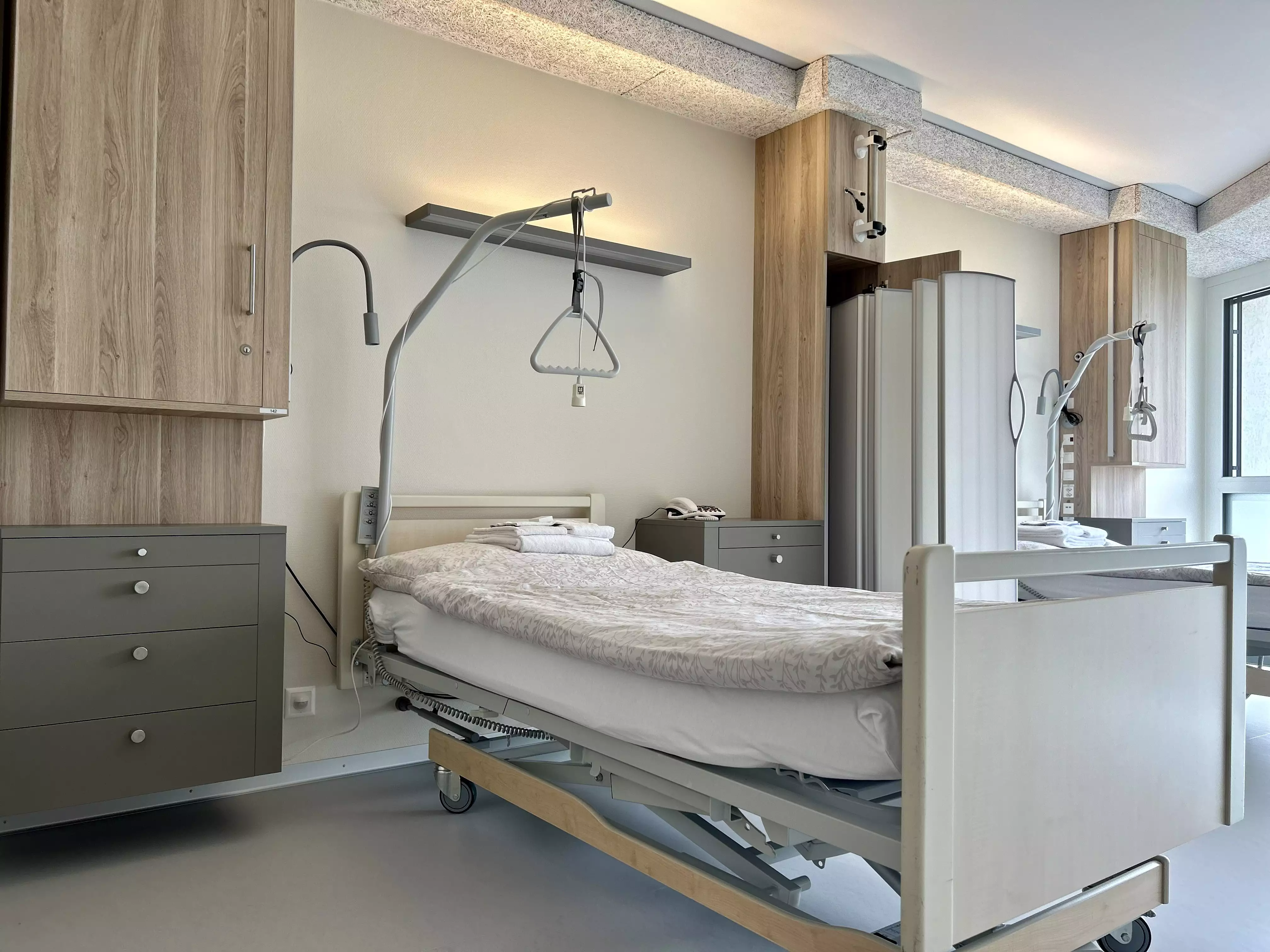Bei der Gestaltung behielten wir die allgemeine Ergonomie und die Optimierung des Raums im Auge. Unser Ziel war es, dass sich die Patienten während ihres dreiwöchigen Aufenthalts wie zu Hause fühlen. Die gewählte Einrichtung mit hochwertigen Möbeln entspricht den Krankenhausstandards und stellt gleichzeitig das Wohlbefinden unserer Patienten in den Vordergrund. Die verschiedenen Aufbewahrungssysteme sind angepasst und garantieren ein Höchstmaß an Privatsphäre, z. B. mit Betttrennwänden auf Rollen.