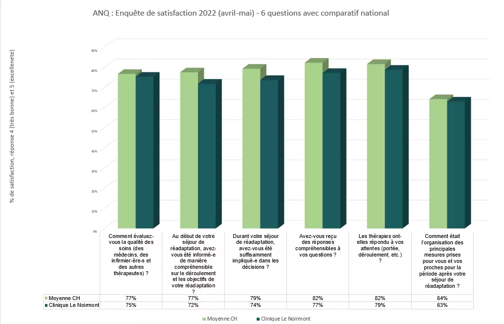 La Clinique Le Noirmont a participé à l'enquête nationale sur la satisfaction des patients dans le domaine de la réadaptation qui est réalisée tous les 2 ans par l’ANQ - l'Association Nationale pour le développement de la Qualité dans les hôpitaux et les cliniques.
